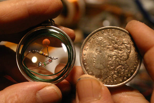 Every Brane-Power amulet contains a working crystal radio circuit, assembled by hand and worn on the body.